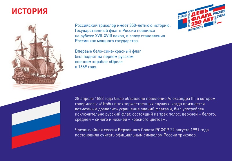 Флаг России является одним из официальных государственных символов Российской Федерации и представляет собой прямоугольное полотнище из трех равновеликих горизонтальных полос белого, синего и красного цвета. Впервые трехцветные стяги упоминаются в указах царя Алексея Романова от 1669 года. Большее распространение полотнище получило при Петре Первом.