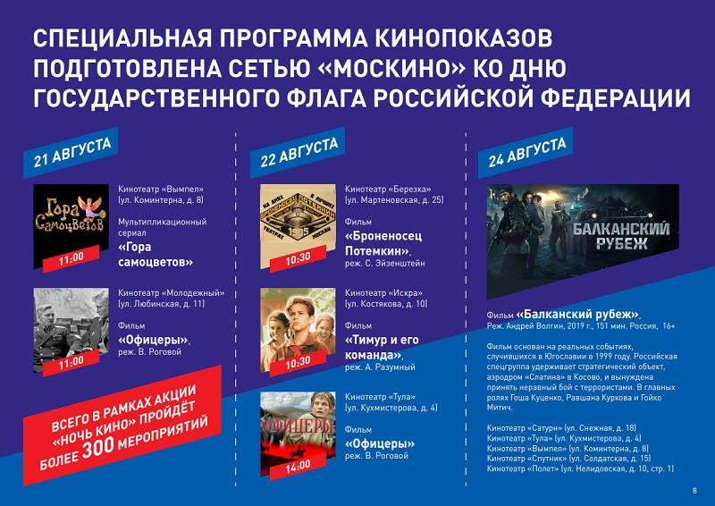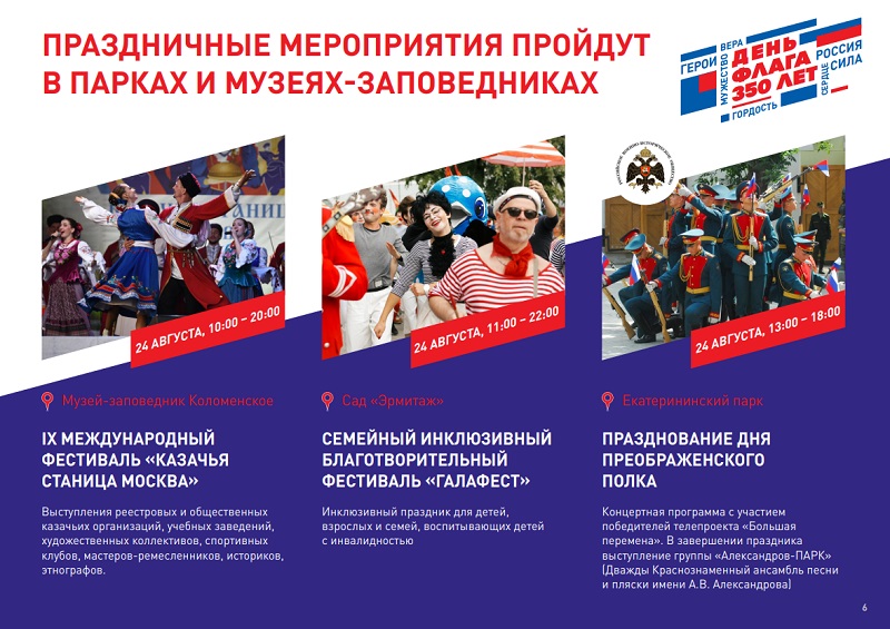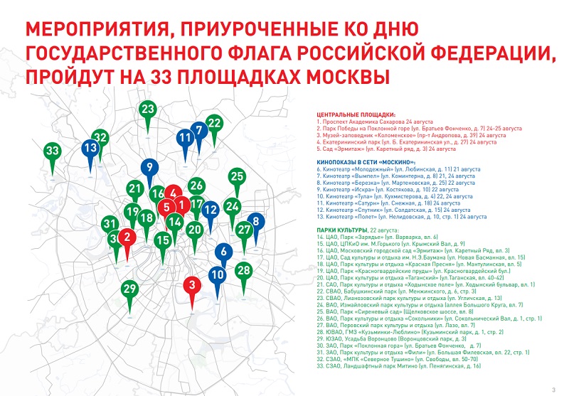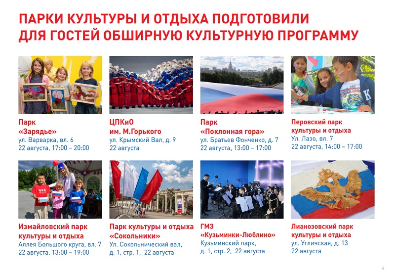 Перед гостями праздничных локаций выступят музыканты из оркестров «Спасской башни». В «Зарядье» развернутся соревнования по сборке спилс-карт нашей страны, а в саду «Эрмитаж» каждый сможет научиться украшать воздушного змея. В Сиреневом саду 22 августа гостей встретят анимационно-игровой программой, а в парке Победы на Поклонной горе в субботу выступят всадники Кремлевской школы верховой езды. Бабушкинский парк отметит День флага музыкальным концертом, Петровский – театральным интерактивным флешмобом.