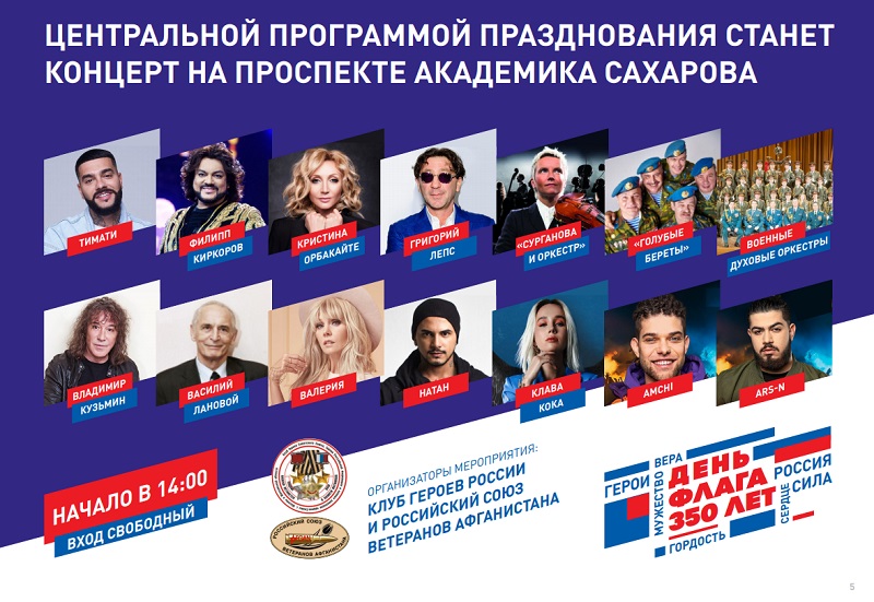 Организаторами стали Российский союз ветеранов Афганистана и Клуб Героев Советского Союза. Благодаря общественной инициативе появилась обширная программа мероприятий. Разнообразие торжеств приурочено к юбилейной дате – в этом году триколору исполнилось 350 лет.