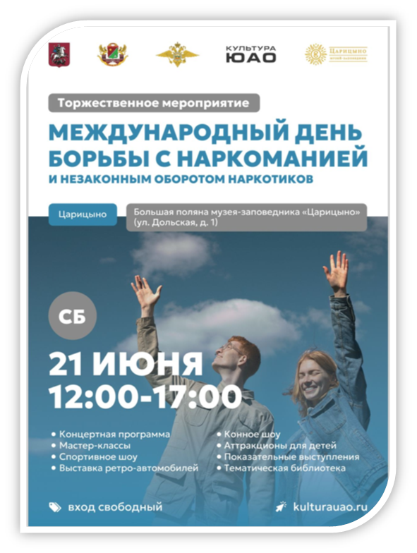 21 июня 2025 года на территории ГМЗ «Царицыно» (на площадке «Большая поляна») Управлением по контролю за оборотом наркотиков  ГУ МВД России по г.Москве, при поддержке Префектуры Южного административного округа г.Москвы и ГБУ г.Москвы «ЮГ СТОЛИЦЫ» запланировано проведение мероприятия, приуроченного к Международному дню борьбы с наркоманией.