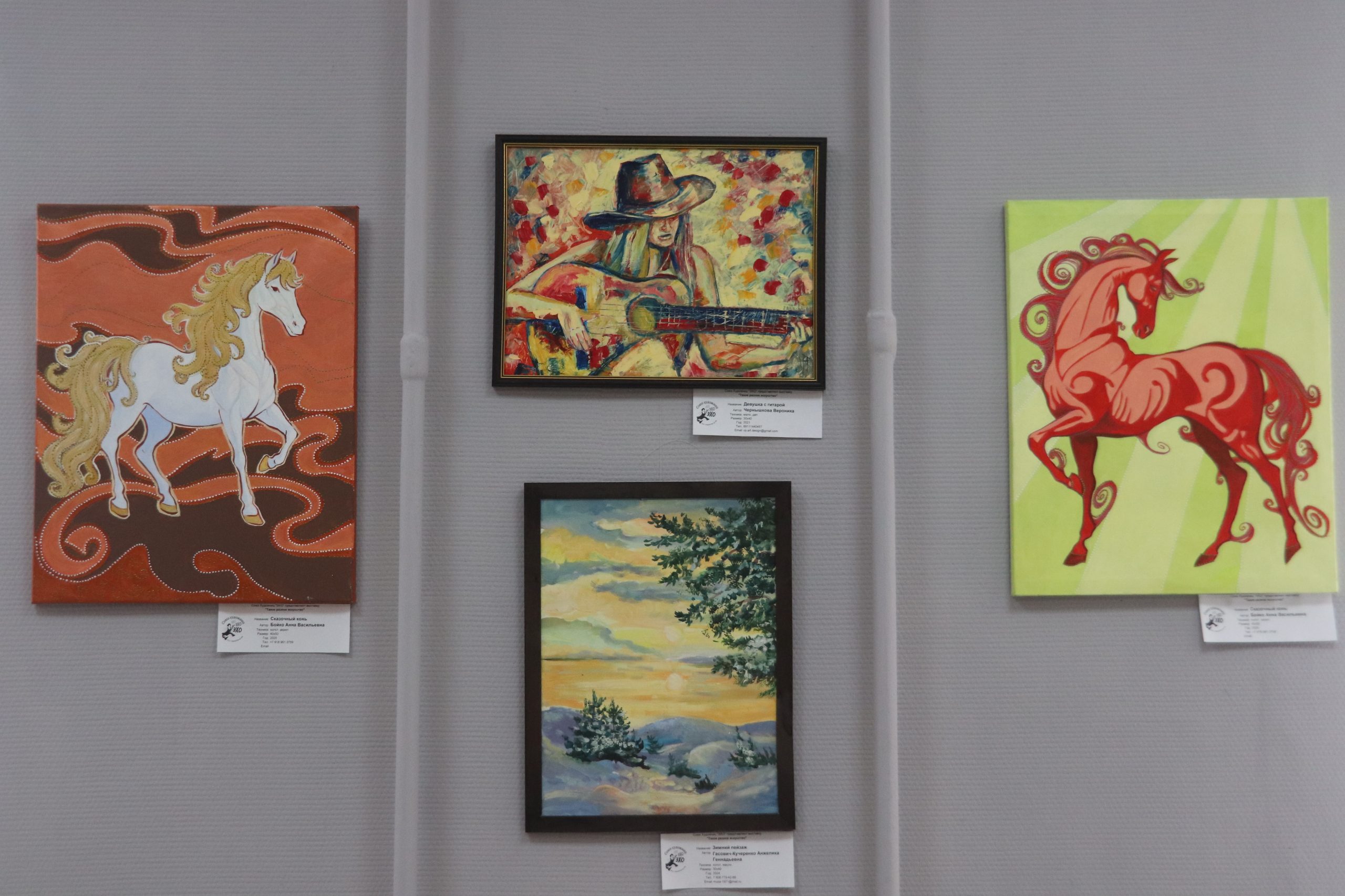 Так, картины представили члены Союза художниц «ЭХО». Посетители смогут увидеть полотна художниц, выполненные в разных жанрах и стилях: от абстракции до реализма, от импрессионизма до наивного искусства, от сюрреализма до символизма. Отметим, что на сегодняшний день выставка пользуется большой популярностью у жителей Даниловского района. Ознакомиться с экспозицией можно в часы работы культурного учреждения.
